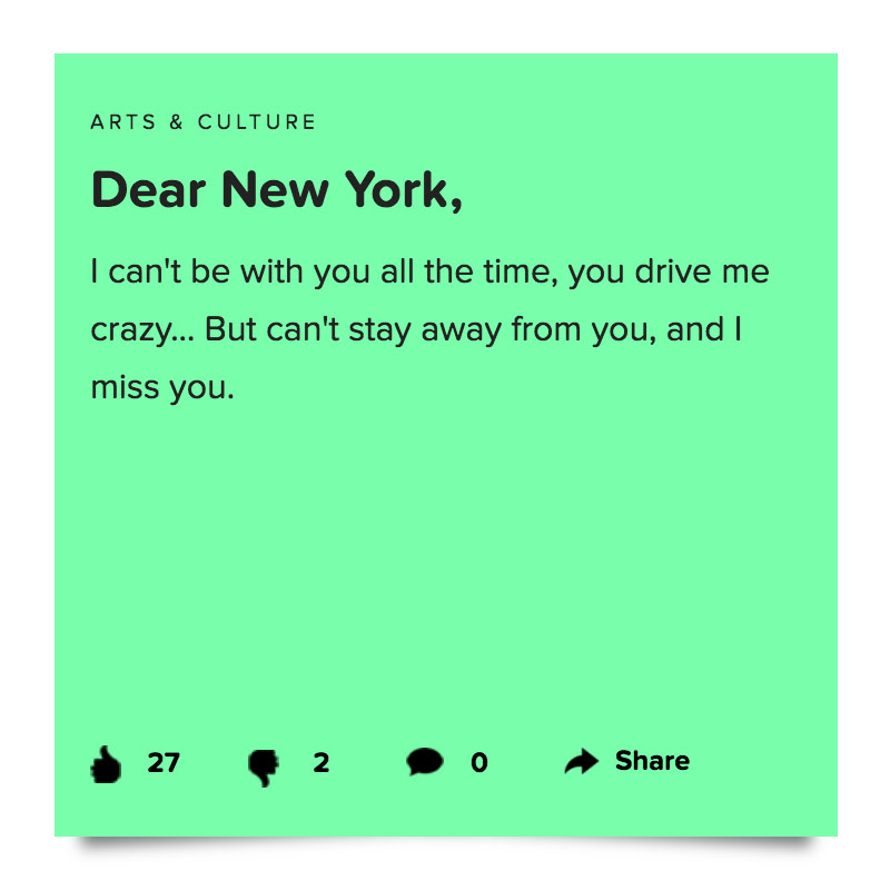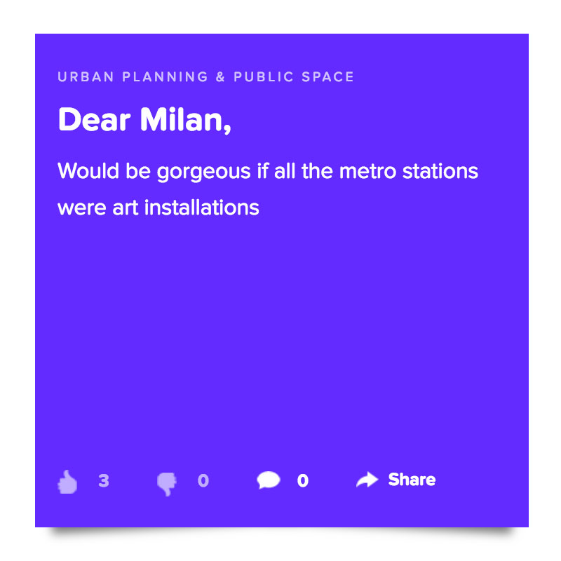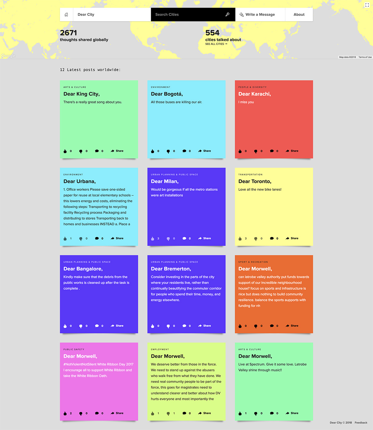 Comment, rant & complain, praise & applaud, suggest ideas and express your thoughts – Dear City lets you write messages to your city, about your city.