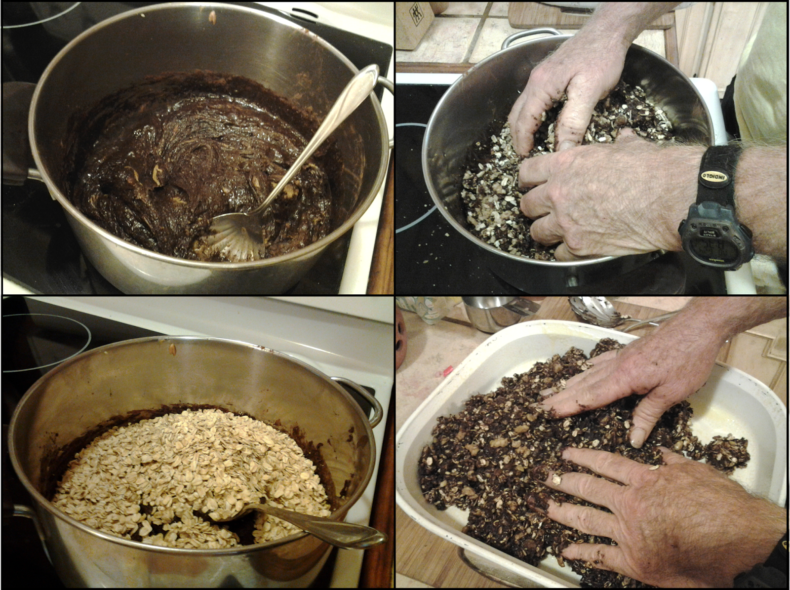 3. Thoroughly mix together (kneading with your hands works best) and press into a greased pan. Refrigerator until solidified and cut into bars. Bars freeze well.